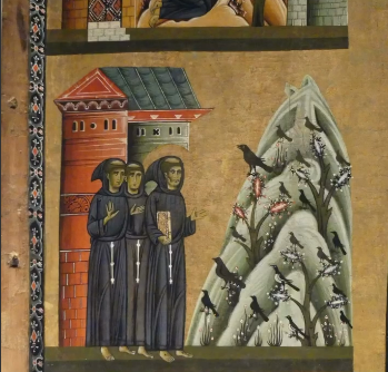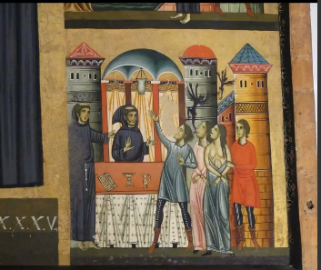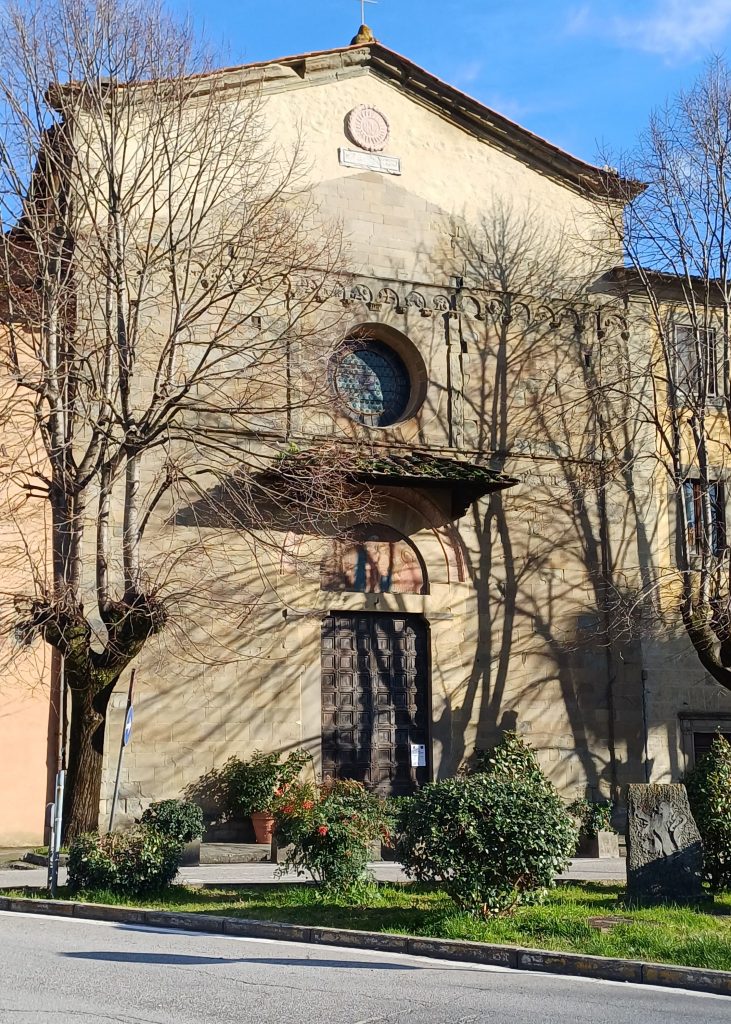 L’opera pittorica più nota che si trova nella chiesa francescana è appunto la tavola del lucchese Bonaventura Berlinghieri che illustra S. Francesco con sei storie ai lati. La pittura del 1235 è stata più volte restaurata; fu infatti riscoperta integralmente nella metà dell’Ottocento. Collocata sull’altare Mainardi si trova l’opera pittorica più significativa, forse la più antica, che raffigura San Francesco d’Assisi e le storie della sua vita. La tavola è stata dipinta da Bonaventura Berlinghieri nel 1235, nove anni dopo la morte di Francesco, è stata più volte reastaurata; fu infatti riscoperta integralmente soltanto nella metà dell’ Ottocento. Si dice che Bonaventura lo avesse conosciuto e quindi avesse potuto riportare le giuste sembianze. Nel 1211 il Santo, era stato ospitato dall’importante famiglia Orlandi che gli aveva donato un terreno nell’area fuori mura denominata Il Prato, dove poi si sarebbe sviluppato il Centro Francescano. Per circa due secoli, però, la tavola sarebbe stata incorniciata da una tela, Gloria di Angeli, realizzata dal pittore uzzanese seicentesco Alessandro Bardelli, e solo negli anni 80 dell’Ottocento sarebbe stata rimossa, grazie al pittore e critico d’arte Michele Ridolfi, svelando così la data, la firma e alcune scene della vita del Santo. In tal modo l’opera è diventata oggetto di studio e di ammirazione tanto da essere stata esposta nel 2023 al Museo Diocesano di Frisinga in Baviera.