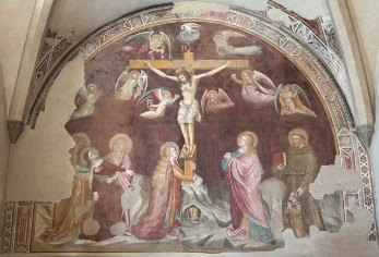 Nei locali della sagrestia, quasi nascosto, si conserva un affresco del ‘300, attribuito a Puccio Capanna, pittore nato ad Assisi e, secondo quanto riferito dal Vasari, allievo della bottega di Giotto. Si tratta della Crocifissione con Angeli e Santi, opera restaurata negli anni ‘70. La lunetta, grande circa 3 metri x 4, mostra il Cristo crocifisso; ai suoi piedi sono raffigurati la Vergine Maria sorretta dalle Pie Donne, la Maddalena, San Giovanni Evangelista, San Francesco (titolare della chiesa) con il devoto segretario e confessore Frate Leone. Uno degli Angeli raccoglie il sangue che fuoriesce dal costato, mentre il pellicano nutre di sangue i suoi piccoli, simbolo dell’amore di Gesù. Sotto la croce si trova il teschio, che ricorda la provvisorietà della vita e simboleggia la redenzione dell’umanità dal peccato originale grazie alla morte di Cristo.