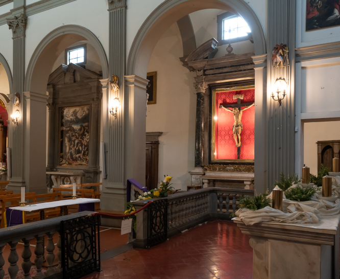 Stone altars were erected, and masterpieces were commissioned to enrich the interiors. Foremost among these is the wooden group of the Announcing Angel and the Virgin Annunciate, both from the late 14th century, closely linked to the school of Valdambrino. On the Sandri family altar, you can find the canvas of the Visitation by Agostino Ciampelli (1594).