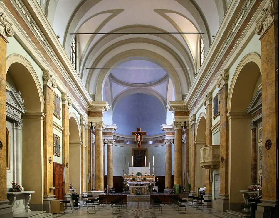 A chapel dedicated to Santa Maria del Castellare is mentioned in the 1260 tax registry (estimo) of Lucchese churches; at the time, it was dependent on the Pieve of San Piero in Campo and stood near the site of the current building. In 1562, a new structure was built on the spot where the Chapel of the Crucifix stands today, thanks to the contributions of the Baldaccini, Minghi, Orsi, and Rosellini families. The Torrigiani family of Lucca donated a 17th-century crucifix to the small church—the work of a German sculptor active in Florence—as well as a carved wooden altar in the Baroque style, a fine example of 17th-century Lucchese craftsmanship. The church is noted as a rectory (rettoria) within the papal brief that established the Diocese of Pescia on March 17, 1727. In 1864, the small temple was partially demolished to make way for the construction of the current Neoclassical building, designed by Carlo Cervelli of Lucca. The first stone was laid on February 5, 1865, and the temple was consecrated by Giovanni Benini, Bishop of Pescia. The church houses works by Antonio Franchi and Benedetto Orsi.