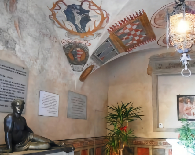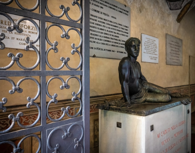 The Memorial (Il Sacrario), dedicated to the Fallen of the Great War and inaugurated in 1938, was created two years earlier from an ancient chapel. This chapel was already decorated with frescoes dating between 1480 and 1510, which relate to various Vicars of Pescia, all belonging to noble Florentine families. Among these, we can mention the oldest one, that of the Pitti family from 1481, followed by those of the Lucalberti, Davanzati, De Nobili, and Ubaldini. In a large niche to the right of the entrance stands the Vittoria Alata (Winged Victory), a bronze by the Pescia-born artist Libero Andreotti (Pescia 1875 – Florence 1933), one of the greatest Italian sculptors of his time. On the left, we find another bronze, Monumento ai Caduti (Monument to the Fallen) an artist from Collodi, Agostino Giovannini.