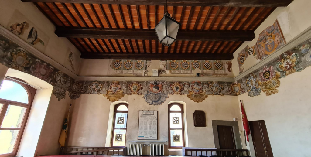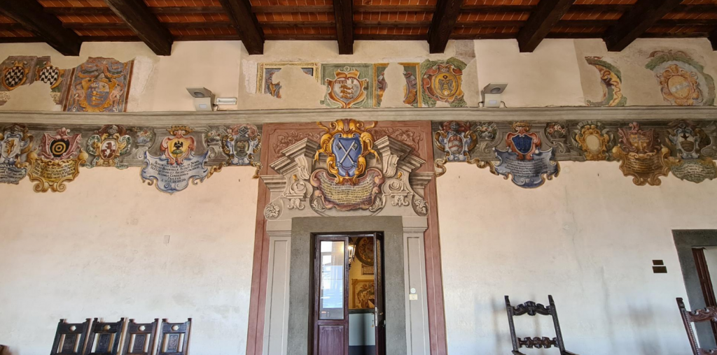The large hall, which overlooks the square and dominates it from above, features two sets of Vicars' coats of arms, some older and fragmentary, above a faux stone frame. These include the Pitti (a band grafted silver and black), the Pandolfini (azure with three swimming dolphins, one above the other), the Mazzinghi, represented by a female figure with well-defined breasts, and others that are anonymous. In some places, the Red Dolphin, symbol of Pescia, appears. Below the frame, a continuous band painted with other Vicars' coats of arms from the 15th to the 18th century runs. At various times, the Vicars' coats of arms had been painted randomly on the walls of the hall. Then, during the works that affected the palace starting in 1719, during the time of Vicar Giovanni Gori, it was decided to give them a certain order by repainting them on the new plaster.